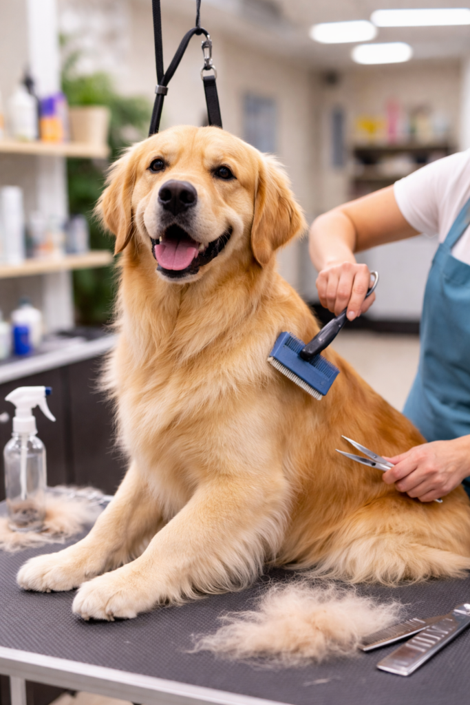 Related to their coat type, Golden Retrievers need bathing every 6-8weeks to help remove buildup within their double coat. However, the Golden Retriever is not a breed that needs regular haircuts, as the breed standards suggest a little trim and sculpting. Due to the long feathers on their hind quarters, Goldens may need freshening up in the winter, as mud and other substances can stick to their coat.